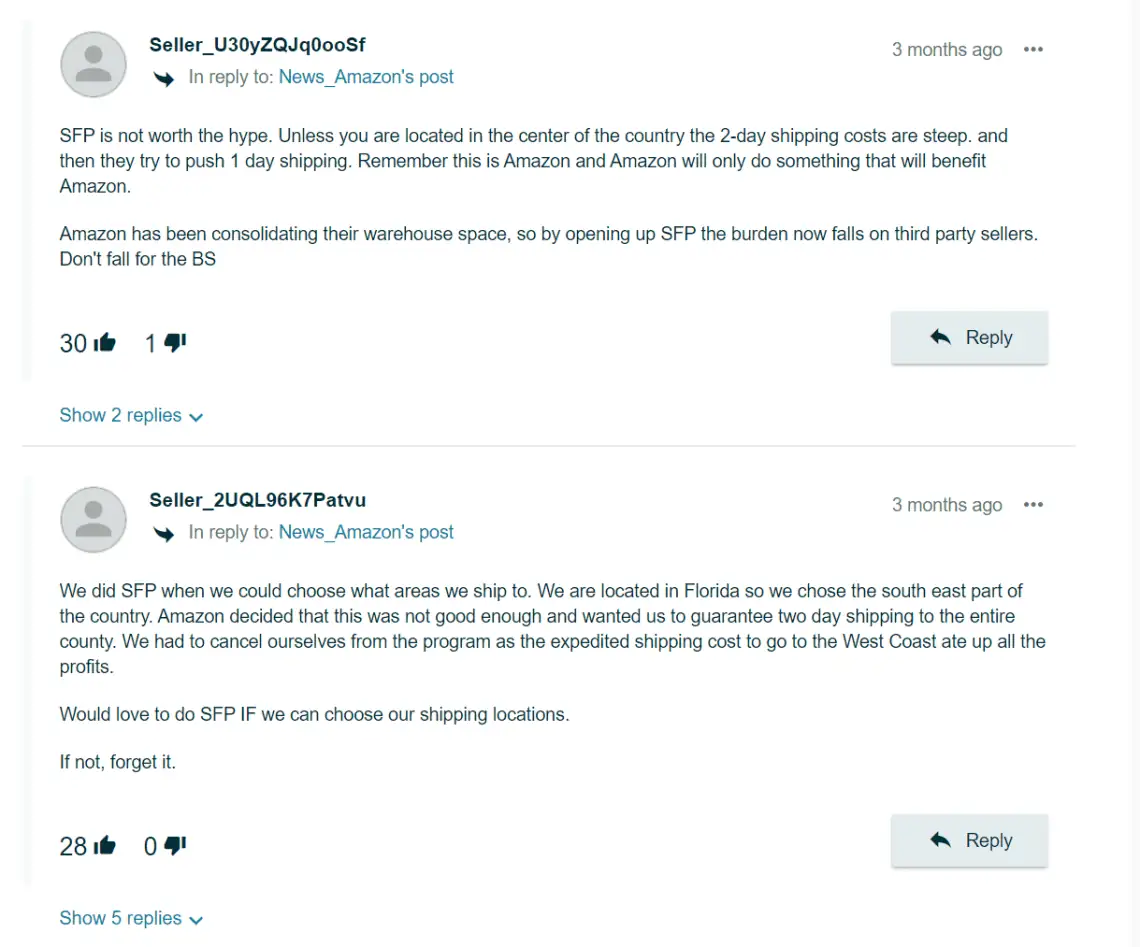 Of course, it’s not all sunshine and roses in the Seller Fulfilled Prime program. Take a quick look at some of the comments from SFP members in the Seller’s Forum discussion and see an unfiltered view of SFP member perspectives: