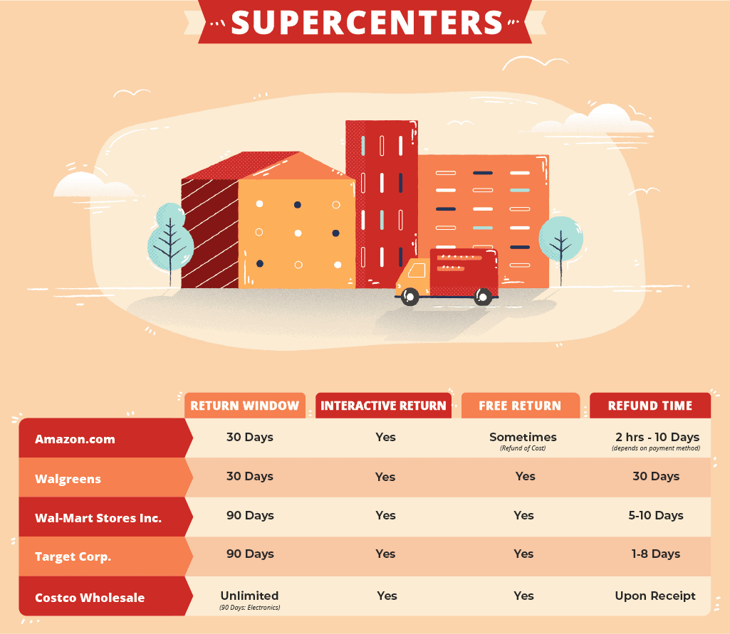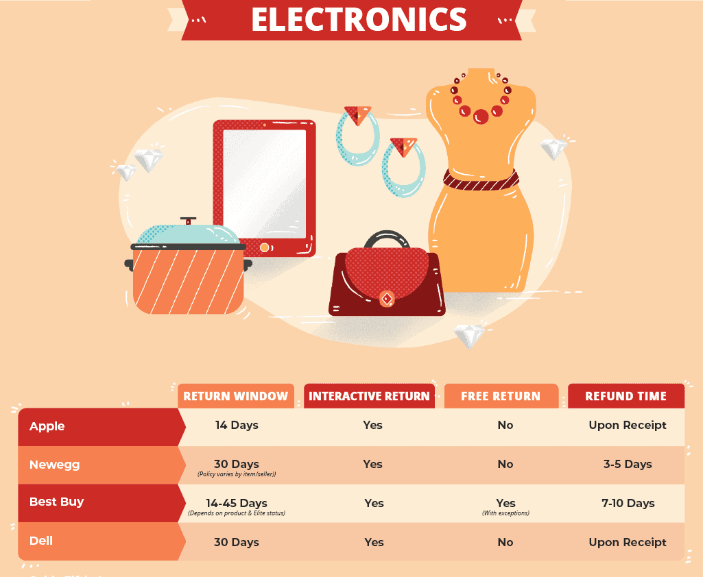 Fortunately, you don’t have to figure this out on your own. When you’re developing return policies for your ecommerce business, the best place to start is to see what other online retailers are doing. We rounded up some of the top online retailers in different categories and analyzed their return policies. We’ve put them together with some handy graphics to give you an overview of how some of the biggest online merchants handle returns.