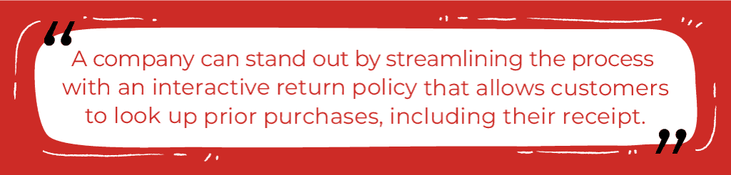 PRO TIP: There are a few features that many of the biggest online retailers include in their return policies to make the process easier for consumers. Interactive returns portals, pre-paid return labels, and the ability to look up past purchases are returns amenities that help make the process smoother and invite repeat business.